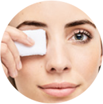 Închide pleoapa. Înfășoară șervețelele umede Blephaclean în jurul degetului arătător. Stai în fața unei oglinzi și deschide pleoapa trăgând ușor pleoapa în sus/jos. Șterge cu grijă marginea pleoapei ca în imagine. Evită să intri în contact cu globul ocular în sine. Curăță pleoapele și zona din jurul ochiului, apoi curăță genele deplasând șervețelul înainte și înapoi de-a lungul marginii genelor cu ochiul închis. Îndepărtează cu grijă eventualele resturi de secreții și cruste.